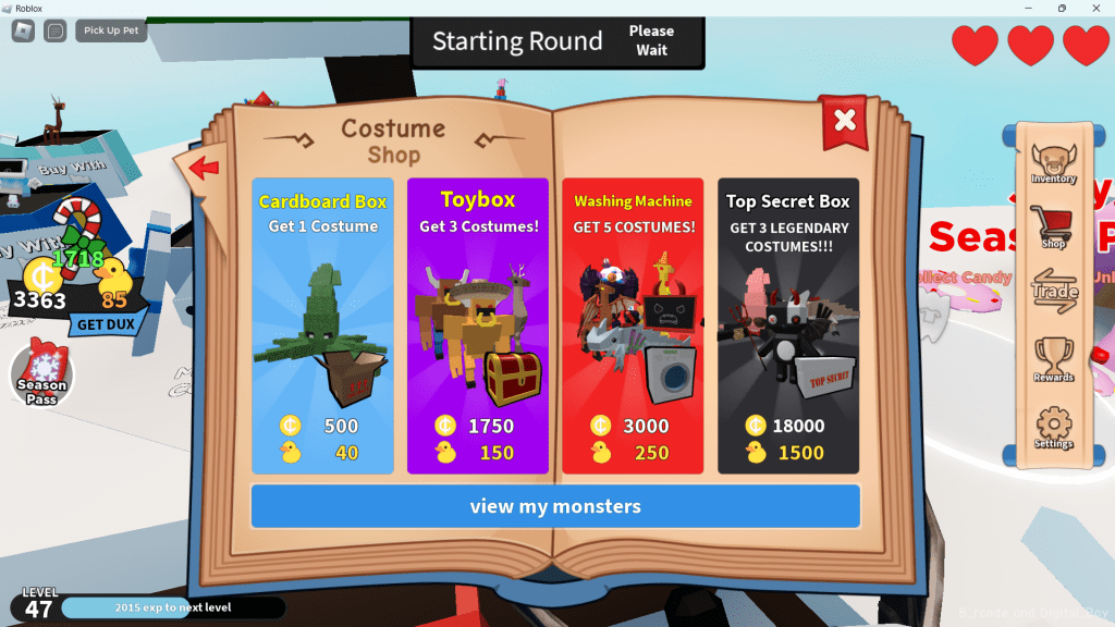 and afterwards you get to pick up candy canes (for xmas) and donuts to get skins this is what you get to choose as monster and how to play: